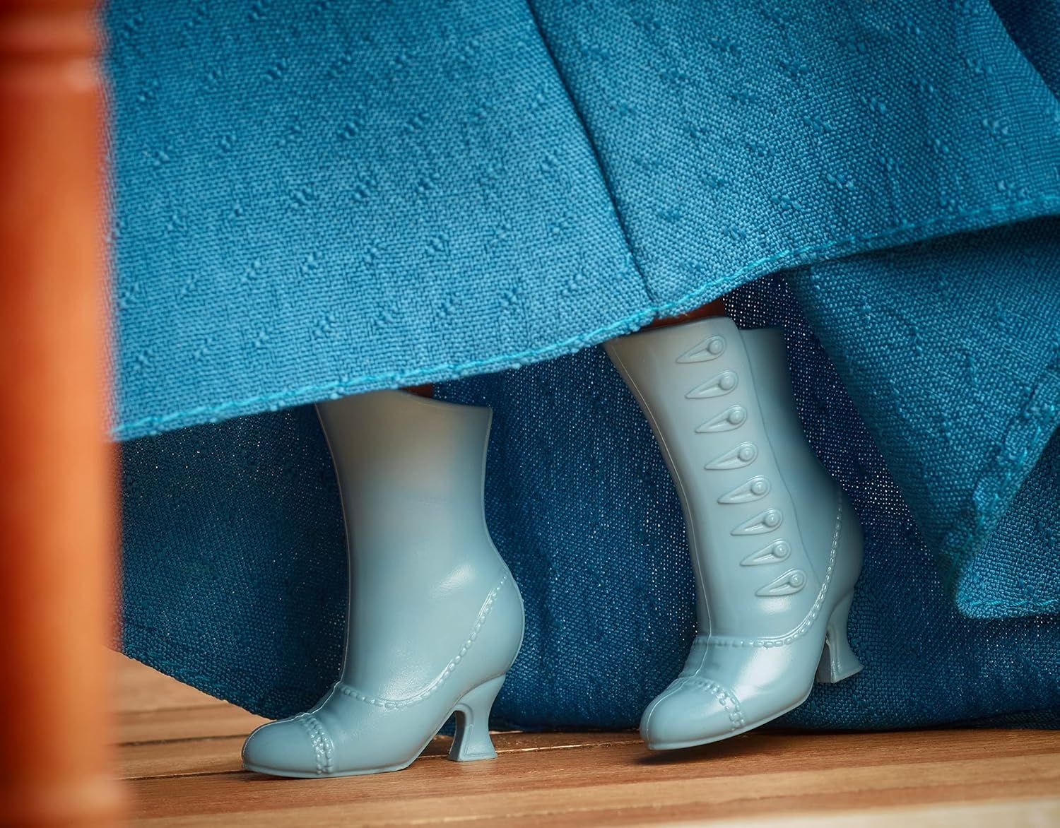 Кукла одета в элегантную блузку с пышными рукавами, длинную юбку и аксессуары, которые отражают стиль и моду того времени. Вместе с куклой поставляются подставка для куклы и сертификат подлинности, подтверждающий её редкость и ценность.