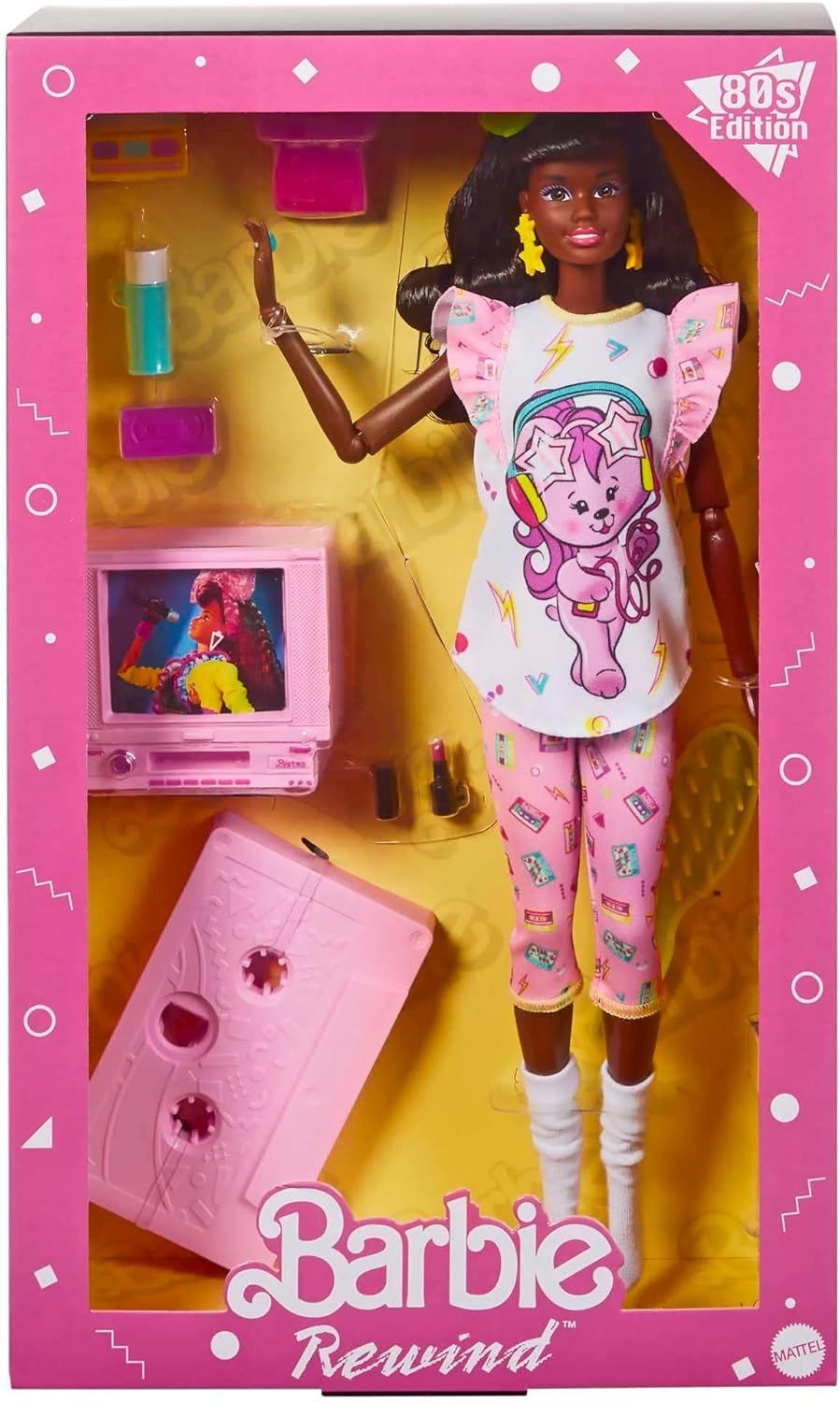 **Barbie Rewind Doll & Accessories with Curly Black Hair & 1980s-inspired Slumber Party Outfit**