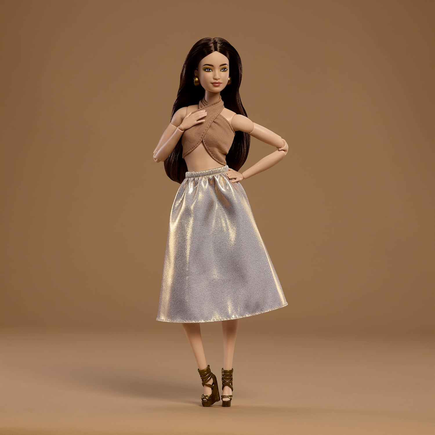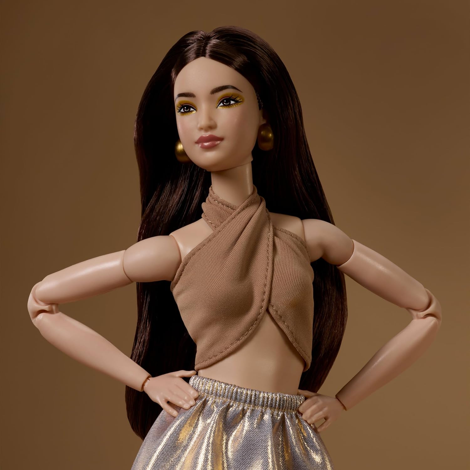 Кукла Barbie Basics Model 06 выделяется в белых брюках-палаццо с изысканным золотистым принтом и бежевом укороченном топе.