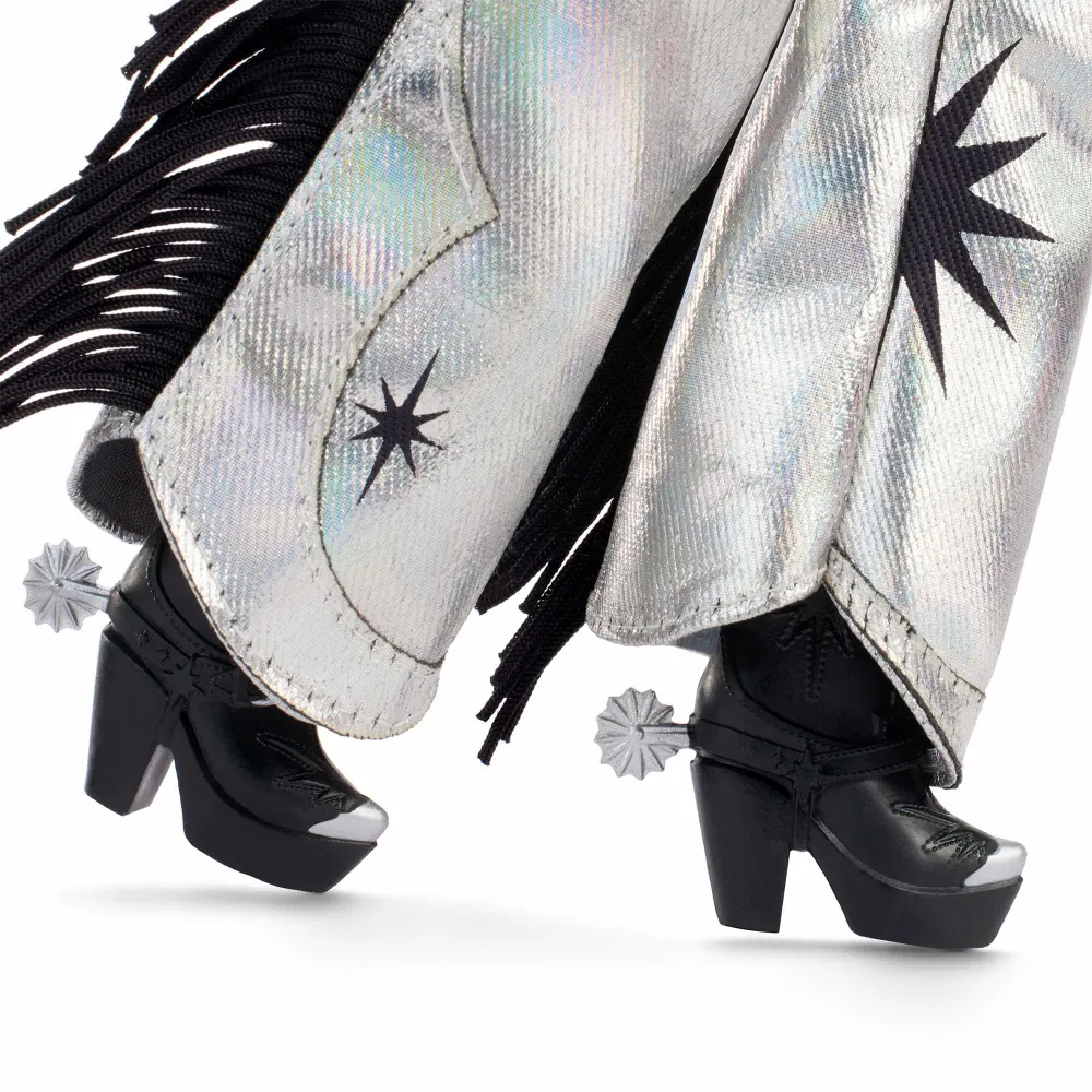 Серия Barbie Fashion Frontier предлагает неземные образы, сочетающие в себе элементы Дикого Запада и космического шика, создавая совершенно новое настроение. Вторая кукла в серии блистает в образе, вдохновленном ночным небом: черный укороченный топ, сверкающая накидка с бахромой и соответствующие серебряные штаны с узором в виде звезд. Она дополняет небесный стиль поясом с пряжкой из страз, кожаными нарукавниками и широкополой шляпой, которые мгновенно возносят ее на вершину славы.