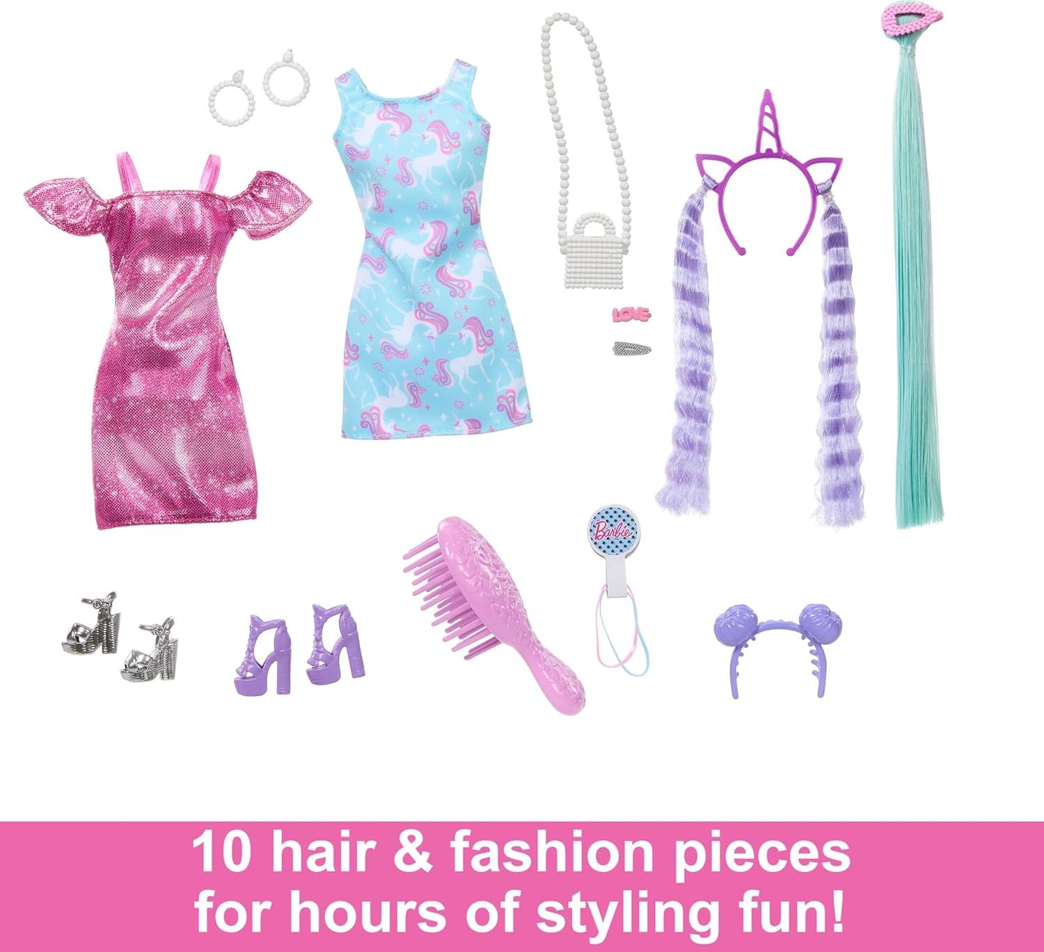 **Barbie Fun & Fancy Set** — это идеальный подарок для юных модниц, которые обожают создавать стильные образы и экспериментировать с причёсками. В наборе вы найдёте модную куклу с экстрадлинными чёрными волосами с цветными прядями, а также множество аксессуаров для одежды и укладки.