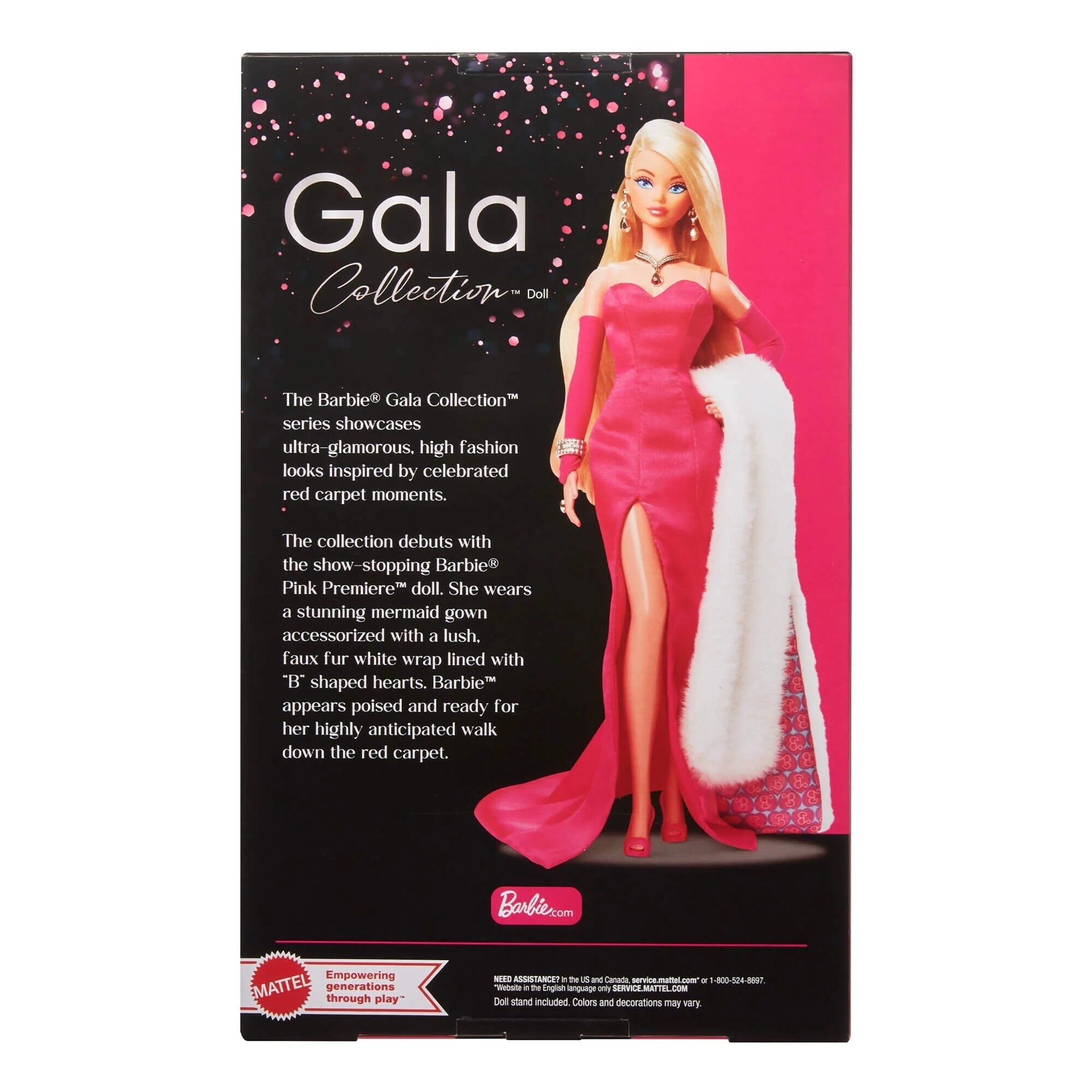 И награда за самый гламурный образ достается... нашей эксклюзивной кукле Pink Premiere Doll! Будучи первой в коллекции Gala, она воплощает в себе звездные моменты, когда дизайнеры и голливудские королевы объединяют усилия, чтобы править красной дорожкой. Розовое платье-русалка Barbiecore, палантин из искусственного меха и туфли на шпильках олицетворяют высокую моду, ее уверенность в себе привлекает внимание.