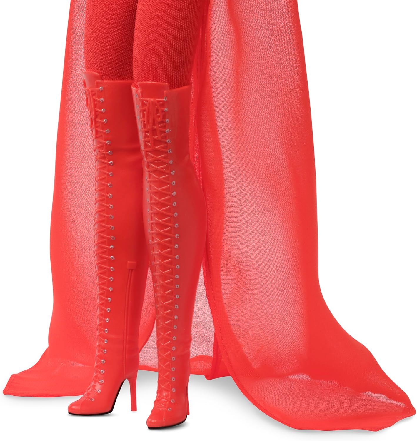 Эта кукла Барби — просто загляденье в красном. Она демонстрирует образ, вдохновленный сногсшибательным нарядом Кайли из ее музыкального видео «Padam Padam», где она была одета в элегантный боди от Mugler и ботинки на шнуровке от Maison-Ernest.