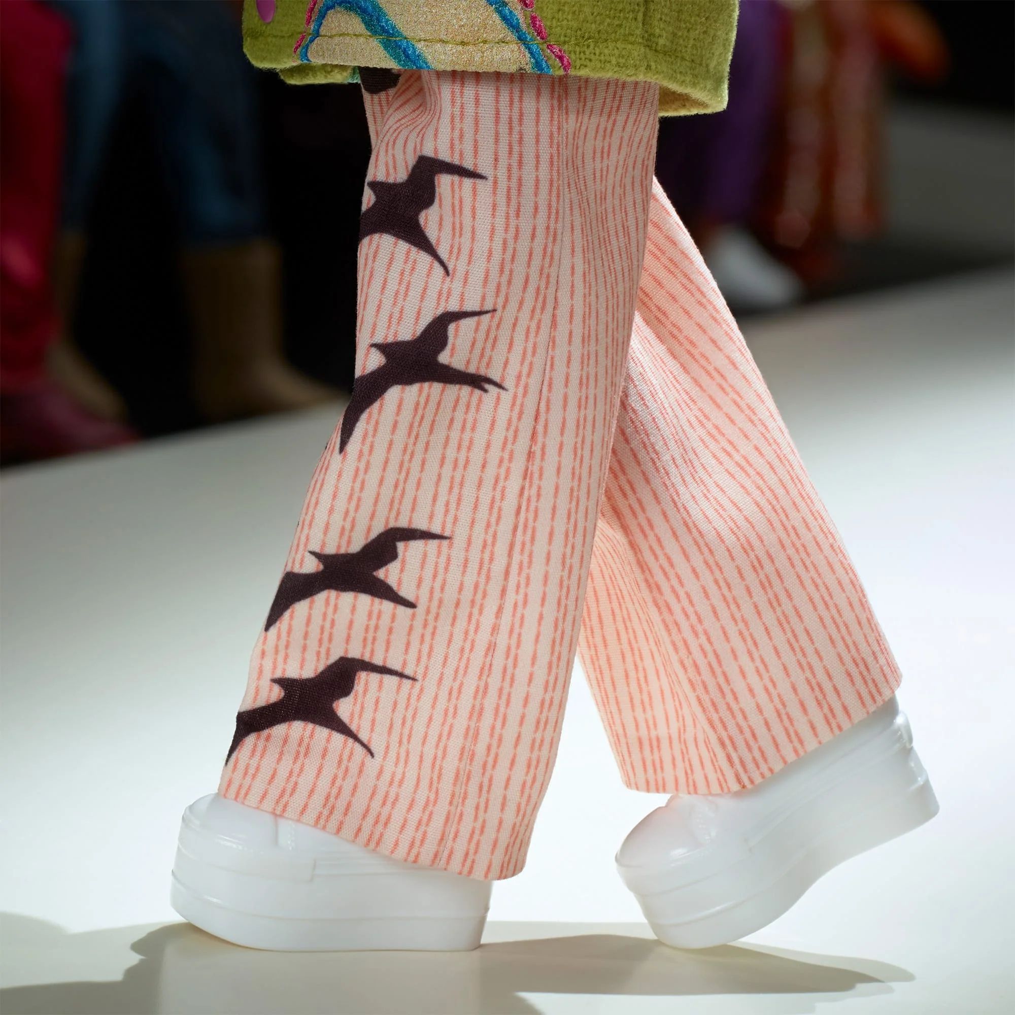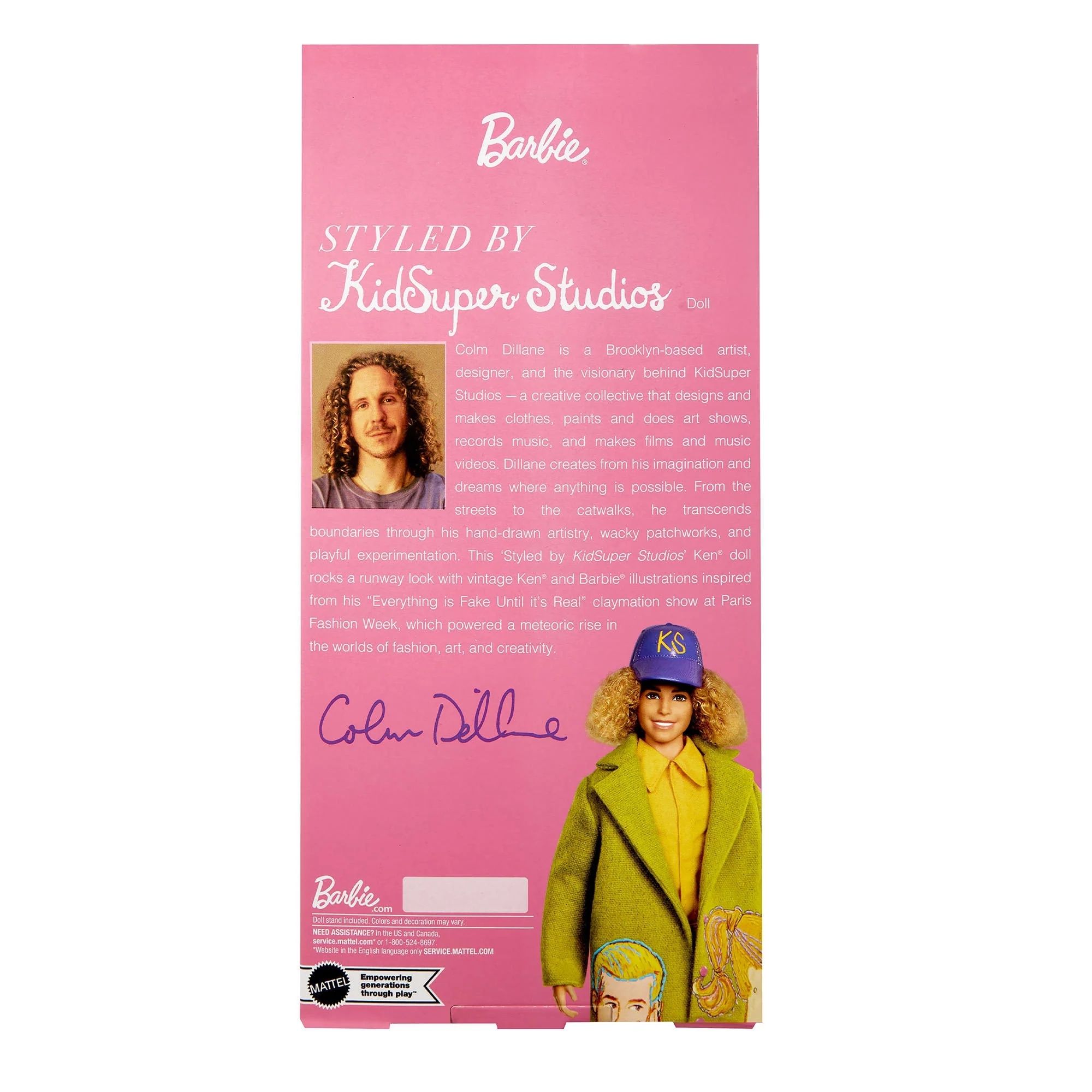 Колм Диллейн, он же KidSuper, художник и дизайнер из Бруклина, является творческой силой KidSuper Studios, коллектива, известного своей модой, выходящей за рамки, художественными выставками, фильмами и музыкой. Для нашей последней куклы Styled by Design KidSuper буквально выводит куклу Кена в центр внимания, в смелом лаймово-зеленом пальто с винтажными иллюстрациями Кена и Барби, вдохновленными показом пластилиновых скульптур KidSuper «Everything Is Fake Until It’s Real» на Неделе моды в Париже.