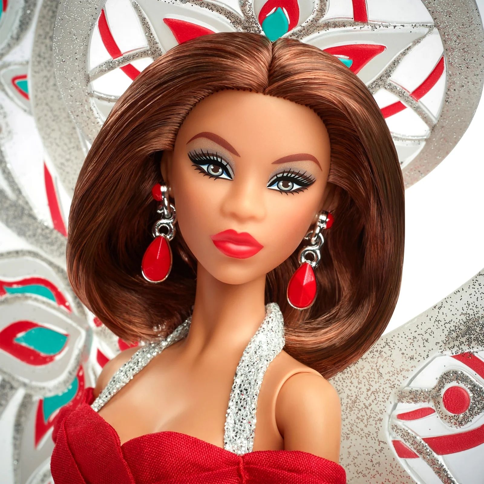 - Кукла Барби, Bob Mackie Holiday Angel в сверкающем серебристо-красном платье.
