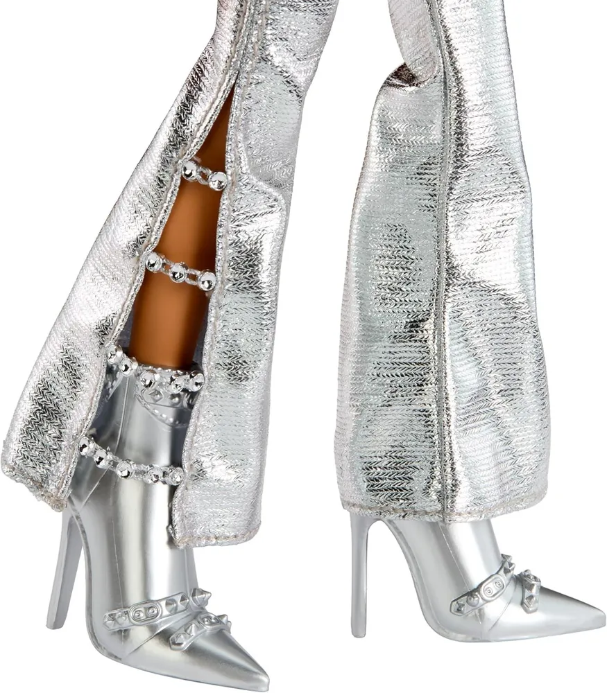 Хромированный образ: Ясмин блистает в хромированном корсетном топе и металлических брюках-клеш.