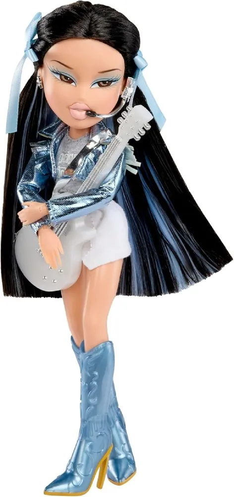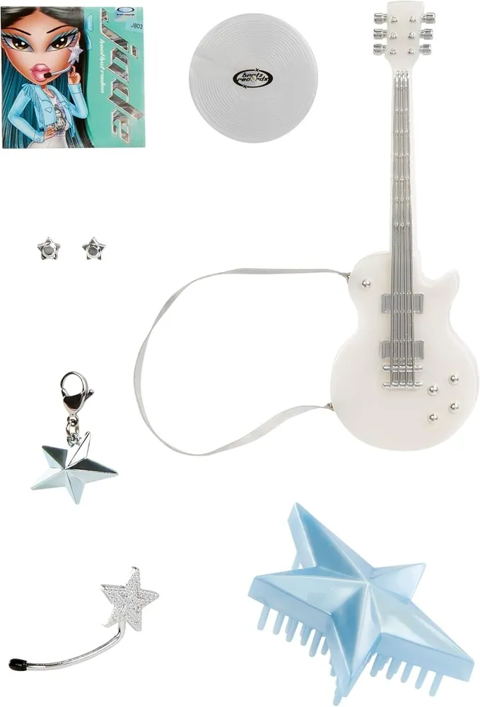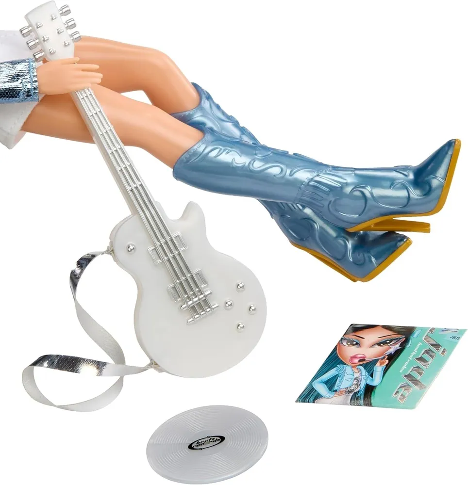 В КОМПЛЕКТ ВХОДИТ: 1 кукла Bratz Pop Starz, 1 куртка, 1 рубашка, 1 юбка, 1 пара сапог, 2 бантика, 1 гитара, 1 микрофон-гарнитура, 1 пара сережек, 1 брелок, 1 расческа, 1 альбом.