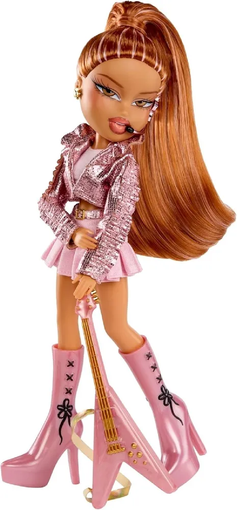 В КОМПЛЕКТ ВХОДИТ: 1 кукла Bratz Pop Starz, 1 куртка, 1 рубашка, 1 юбка, 1 пара сапог, 1 гитара, 1 микрофон-гарнитура, 1 пара сережек, 1 брелок, 1