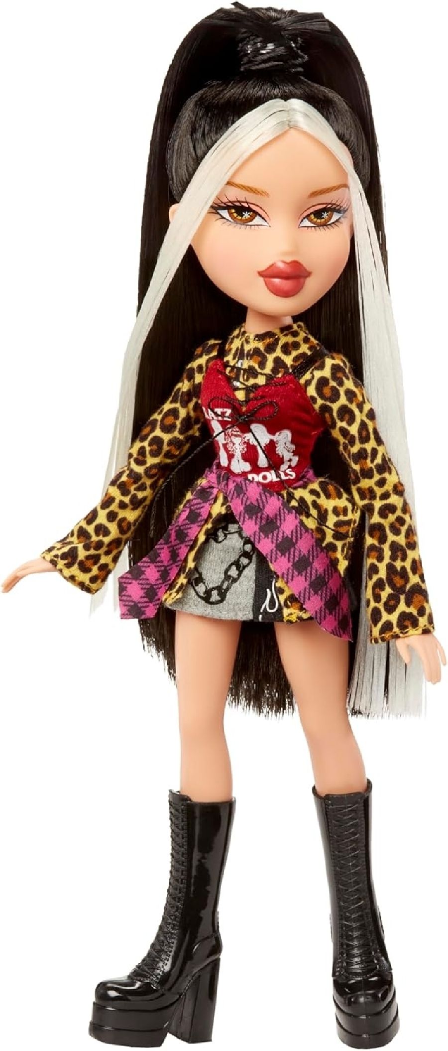 Братц вернулись с новыми стильными образами, но на этот раз они хотят поделиться с вами своей страстью к моде! Эта кукла Братц идёт в комплекте с рубашкой, которую вы можете выбрать. Индивидуальный стиль, единая страсть! Джейд преобразила свою футболку с принтом, превратив её в укороченный топ и надев поверх леопардовой рубашки на пуговицах. Дополнила образ юбкой, сапогами, сумочкой в тон и стильными очками. У неё длинные волосы со светлыми прядями, а обесцвеченные брови придают образу лёгкий гламур.