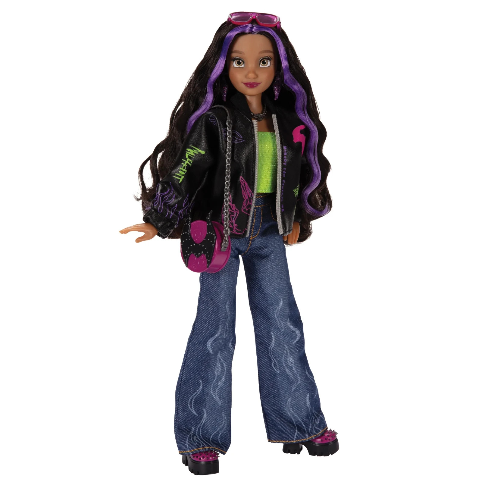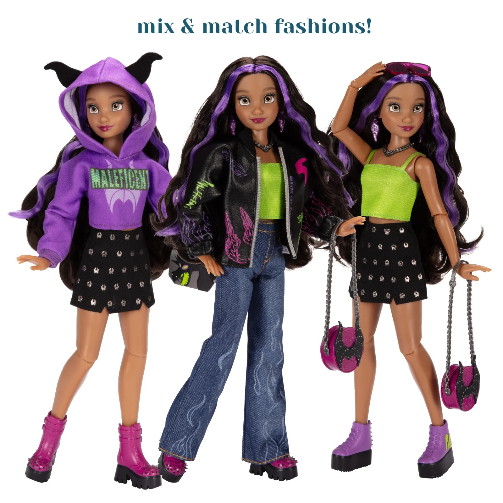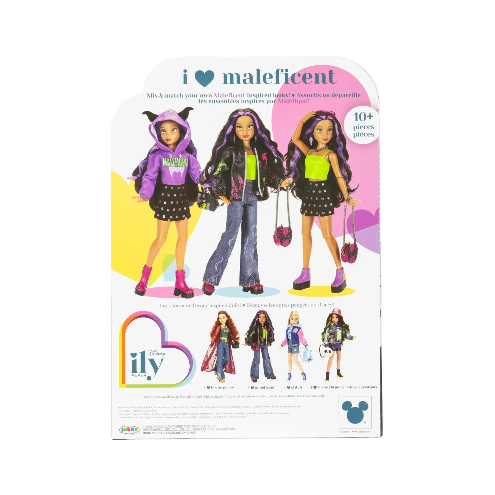 Завораживающая кукла : Кукла Малефисента из коллекции Disney ily 4EVER одета в куртку из искусственной кожи с неоновым принтом и джинсы с принтом в виде языков пламени, воплощающие мрачный стиль.