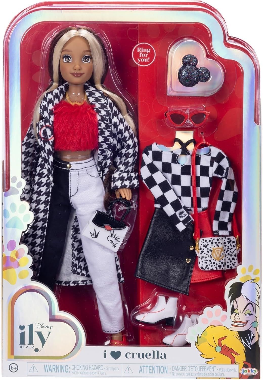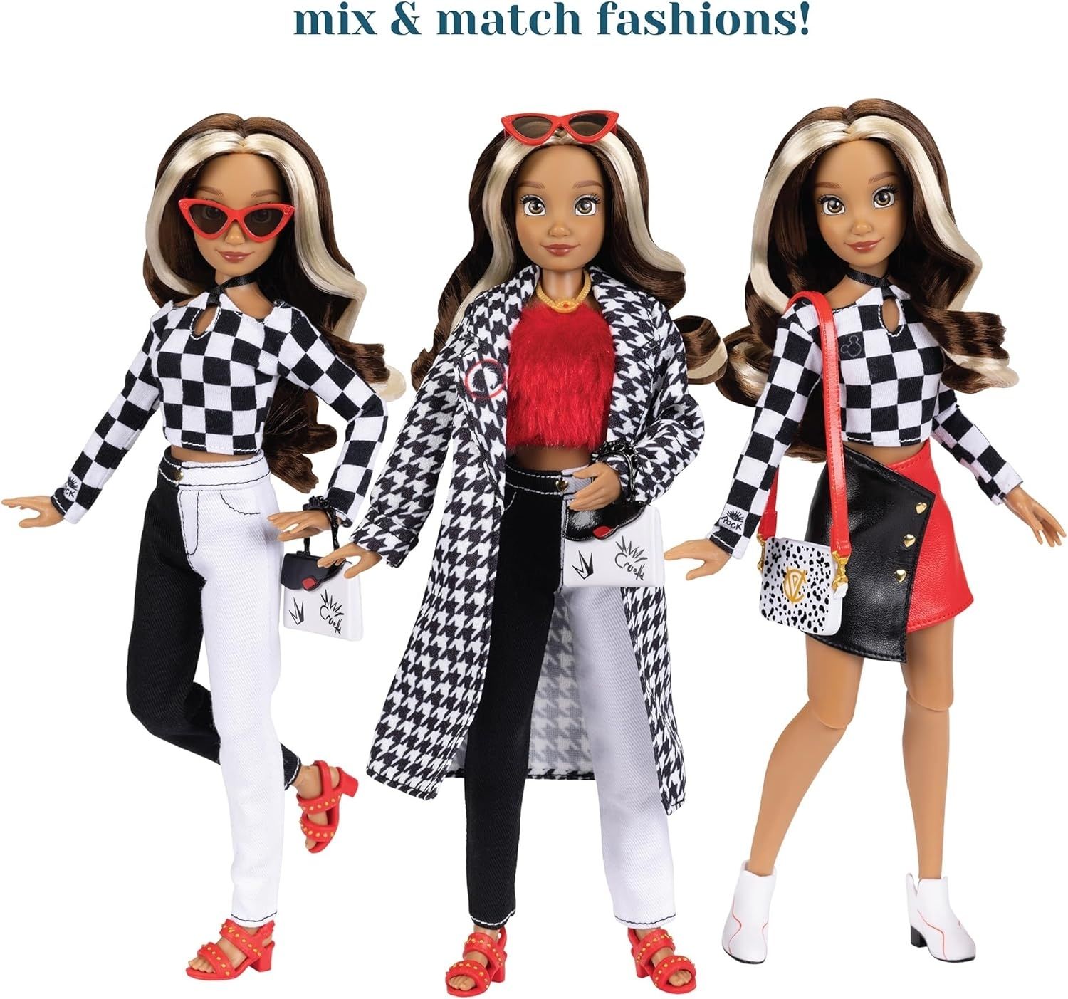 - Кукла Disney ily 4EVER i ♡ Круэлла одета в моду с головы до ног в пальто с рисунком «гусиная лапка» и двухцветных джинсах.