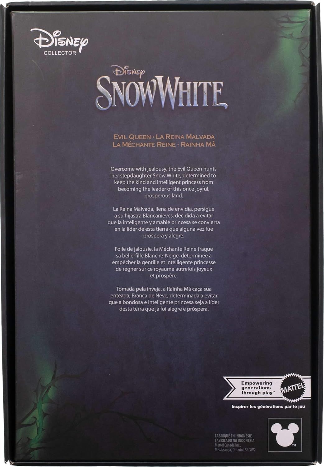 - В честь захватывающего игрового фильма Disney «Белоснежка» эта специальная коллекционная кукла Злой Королевы изображает удивительно коварную злодейку в мельчайших деталях.