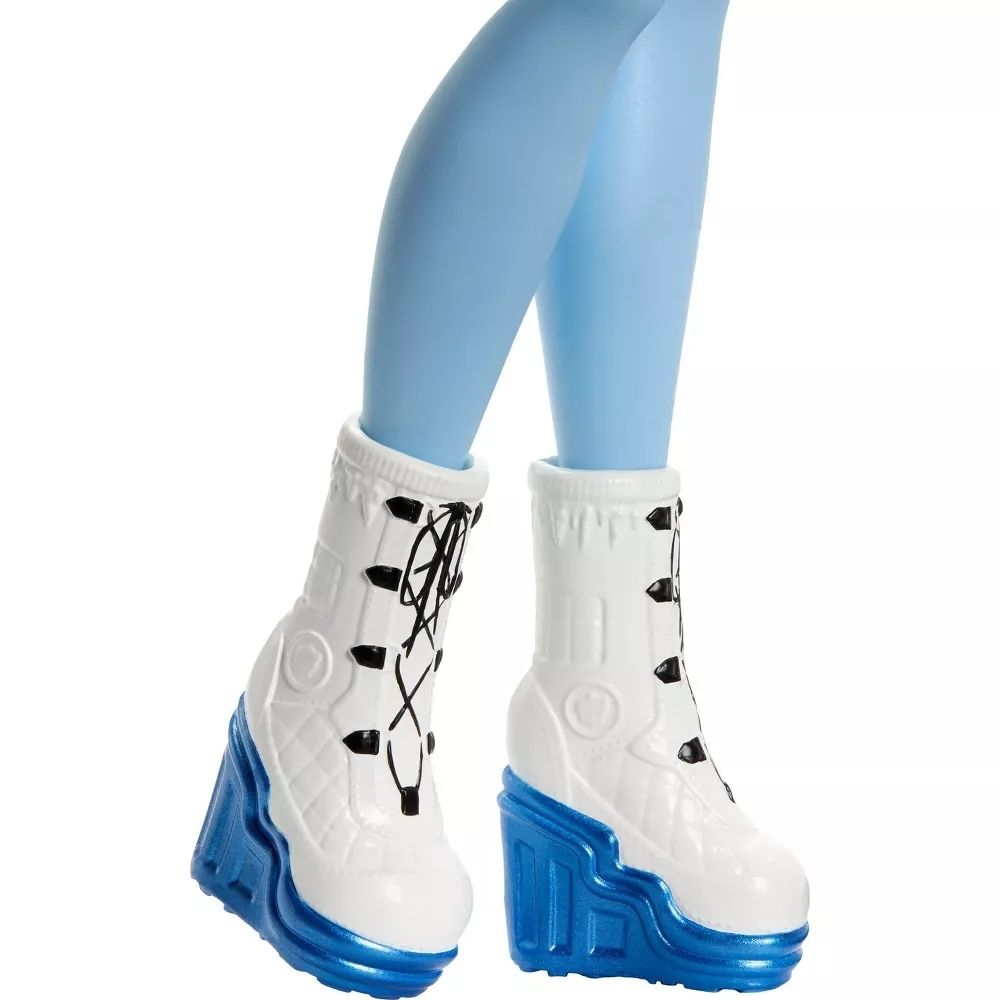 - Кукла Эбби Боминейбл одета в фиолетовый кардиган, мини-юбку с ледяными кристаллами и сапоги на каблуках. В комплекте также идёт университетская куртка клуба «Искусства и жуткие ремёсла» для фотографий в «Клубе страха»!