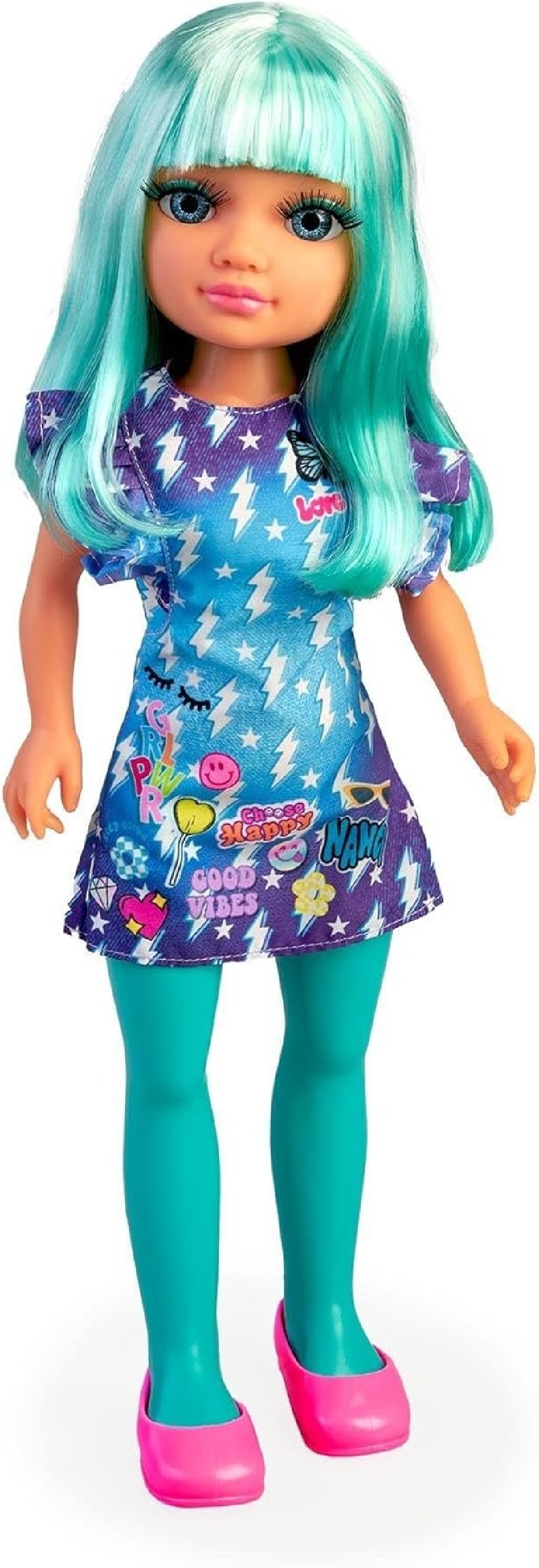 - На ней потрясающее сине-фиолетовое платье, украшенное молниями, смайликами, бирюзовые колготки и розовые туфли!