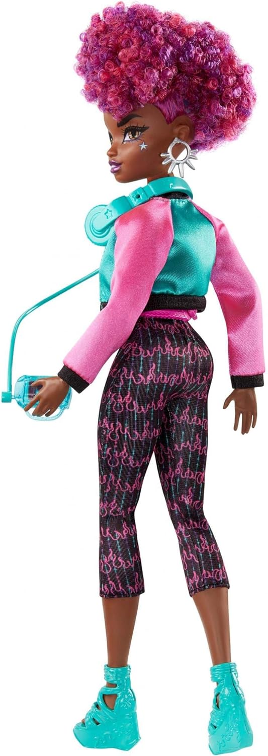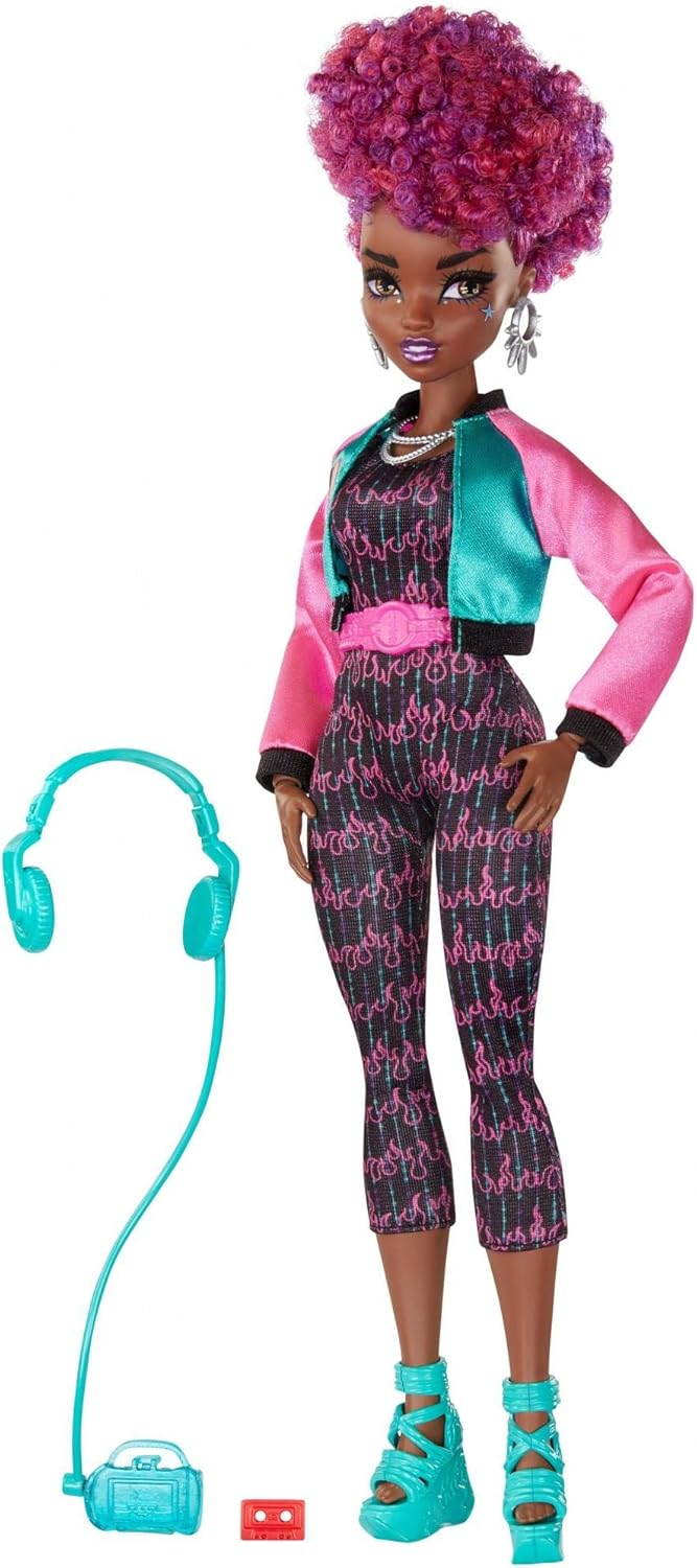Она носит стильные вещи, такие как аккуратный комбинезон, блестящая университетская куртка и босоножки на ремешках, а также оснащена накладными наушниками и ретро-аксессуарами, например, кассетным плеером со съемным ремешком, что добавляет веселья в процесс рассказывания историй.