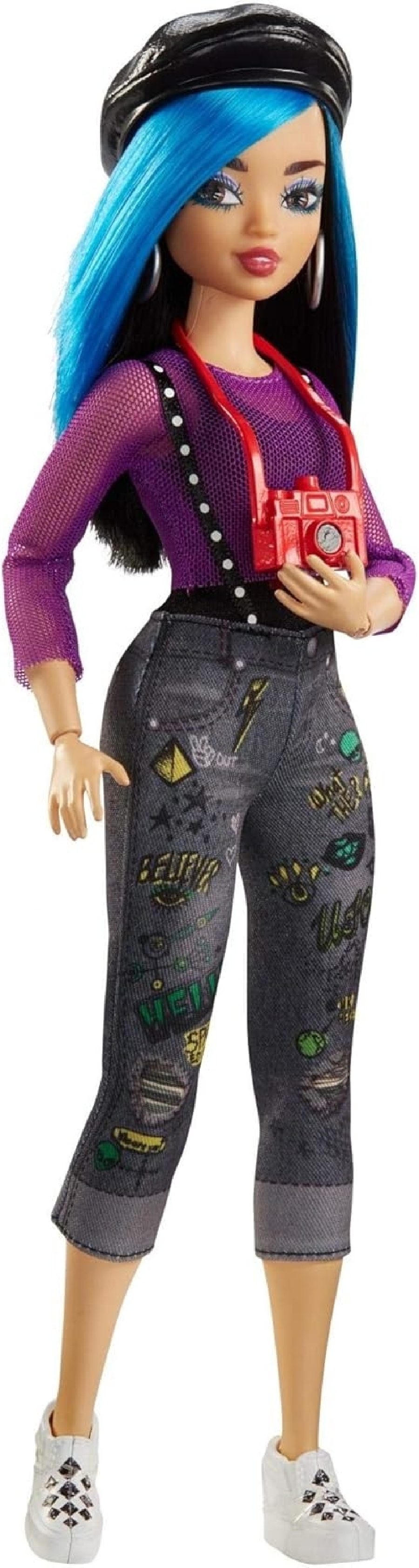 - Она приходит в стильных вещах, таких как берет, подтяжки с заклепками, рваные джинсы, крутые кроссовки и камера.