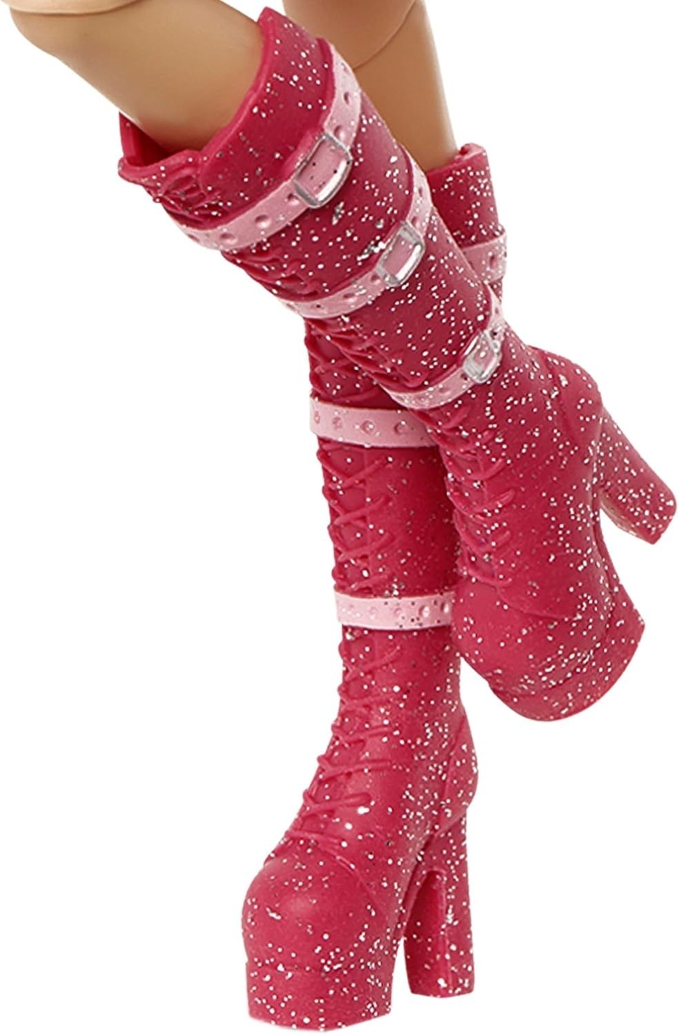 - Одета в сверкающий розовый костюм-двойку с подходящими сапогами.