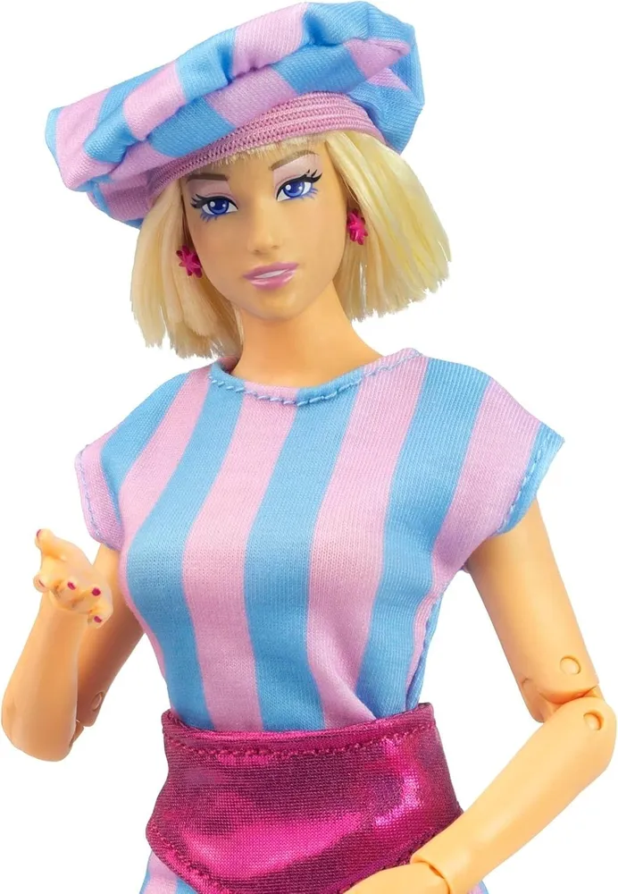 12-дюймовая Джеррика полностью подвижна, одета в классическое мини-платье в пастельную полоску с ярко-розовым блестящим поясом, у нее короткая стрижка боб светло-русого цвета и фирменные серьги JemStar.